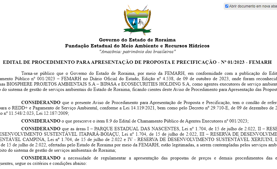 Torna-se público que o Governo do Estado de Roraima, por meio da FEMARH, resolve ALTERAR o cronograma do Edital de Procedimento para Apresentação de Proposta e Precificação – Nº 01/2023 – FEMARH, publicado no Diário Oficial do Estado, Edição nº 4.549,… DO EDITAL DE PROCEDIMENTO PARA APRESENTAÇÃO DE PROPOSTA E PRECIFICAÇÃO – Nº 01/2023 – FEMARH